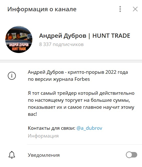 Андрей Дубров | HANT TRADE – это проект в Телеграмм трейдера Андрея Дуброва (@a_dubrov). Если верить тому, что написано в заставке канала, то Андрей Дубров, это крипто прорыв 2022 года, причем якобы по версии такого авторитетного американского журнала, как Forbes. Но потенциальных подписчиков с самого начала вводят в заблуждение – никаких подтверждений этому заявлению на самом деле нет. Далее разберемся, какие еще факты вызывают сомнение в честности автора проекта.