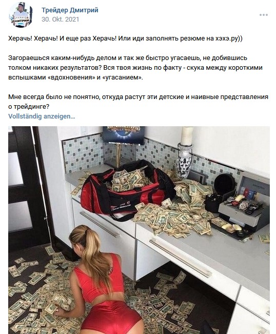 Если заглянуть на vk.com/signalsforpr0, то нашему взору откроется этакий рубаха-парень. Он много путешествует, ездит на дорогих автомобилях и рассказывает о трейдинге так, словно это самый простой вид деятельности. И, конечно же, он одарит чуть ли не любого легкими деньгами. А дальше по сценарию: тачки, яхты и т. п.