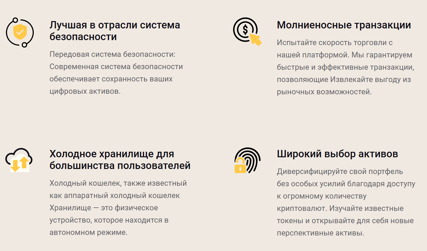 Пользователям доступна продажа/покупка известной криптовалюты. Еще доступны другие услуги – слотовая торговля, опционы, фьючерсы. Предлагаются криптовалютные обмены, функции копирования торговли.