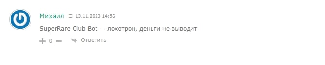 Отзывы о боте SuperRare INC ожидаемо крайне негативные. Пользователи не стесняясь называют проект лохотроном. Сообщается, что проблемы начинаются при выводе денежных средств: создатели компании отказываются сразу совершить выплату, продолжают высасывать деньги из клиента под всевозможными предлогами.